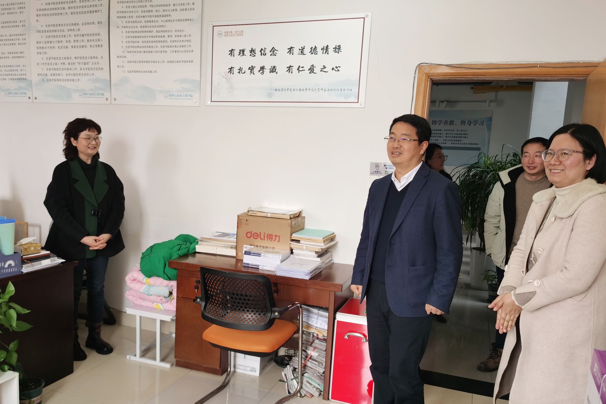 2月26日,新学期伊始,老虎机 党委委员、副校长於建明到材纺老虎机 走访慰问教职工,为老虎机 教职工送上诚挚祝福与殷切关怀,并调研指导新学期开学工作情况。