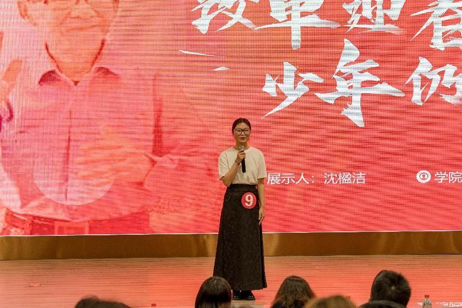 在决赛现场,沈楹洁同学以《改革迎春风,少年仍需行》为题,以“一件T恤”开头,讲述了步鑫生“砸掉铁饭碗”的企业改革故事,再现了步鑫生的改革创新精神,呼吁青年学子要以自身专业特长凝聚青年力量,用自身行动传递奋斗新时代的声音。