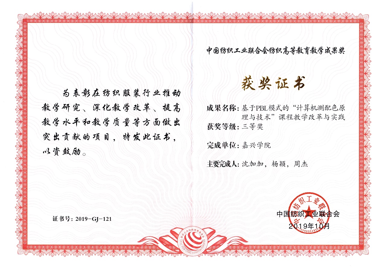 会上发布了“纺织之光” 2019年度中国纺织工业联合会高等教育教学成果奖评审结果,老虎机 纺织工程系副主任沈加加副教授主持的《基于PBL模式的“计算机测配色原理与技术”课程教学改革与实践》教学成果荣获三等奖。
