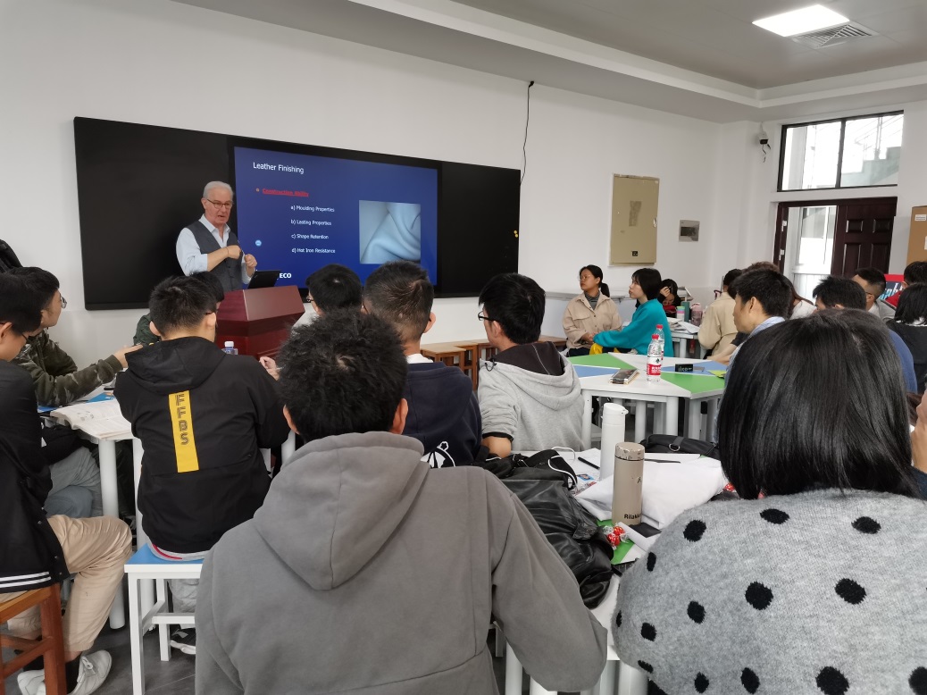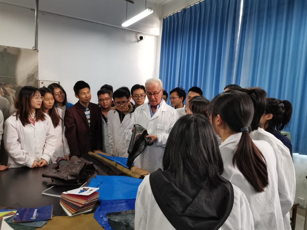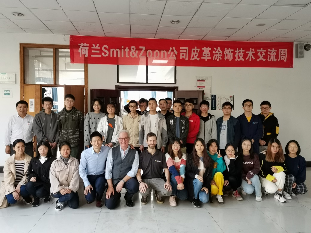 轻化工程专业教育事业的支持,同时,简要介绍了近年来轻化工程专业在专业建设、人才培养、教学科研及实验室建设等方面的发展情况。其次,徐建平经理给师生们简要介绍了公司的情况及并对同学们提出希望。随后,开启了“Smit&Zoon皮革涂饰技术交流周”。Fabriozio Ugolini博士给师生全英文讲解“LEATHER FINISHING COURSE:Meet Technology and Art”讲座。