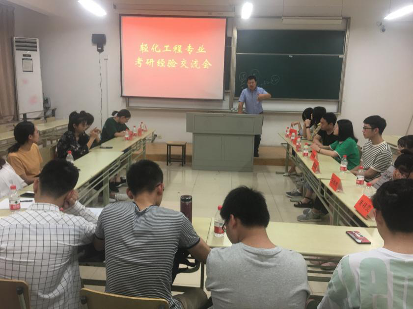 轻化工程专业考研学生存在的疑惑,帮助他们明确考研目标、掌握相关考研技巧,轻化工程系于5月24日晚上在10号楼406教室举行了考研经验交流会。轻化工程系全体教师、轻化15级考研成功学生、轻化16级和17级考研学生代表,以及在南京工业大学攻读研究生的轻化13级孙钰同学和轻化14级秦梦漪同学参加此次活动。