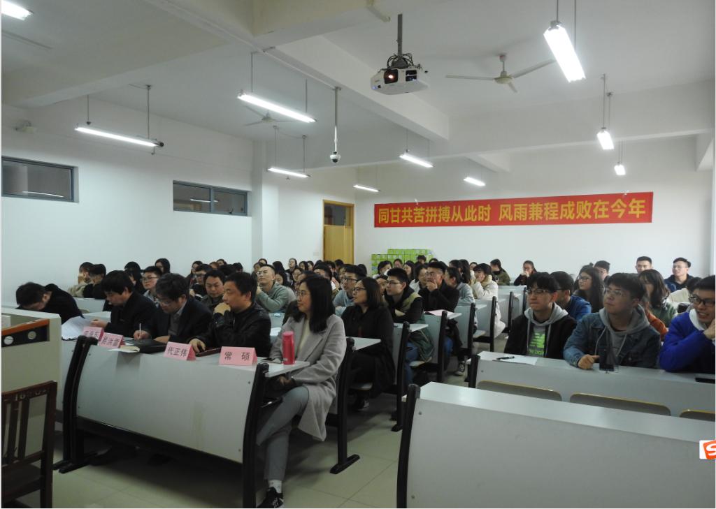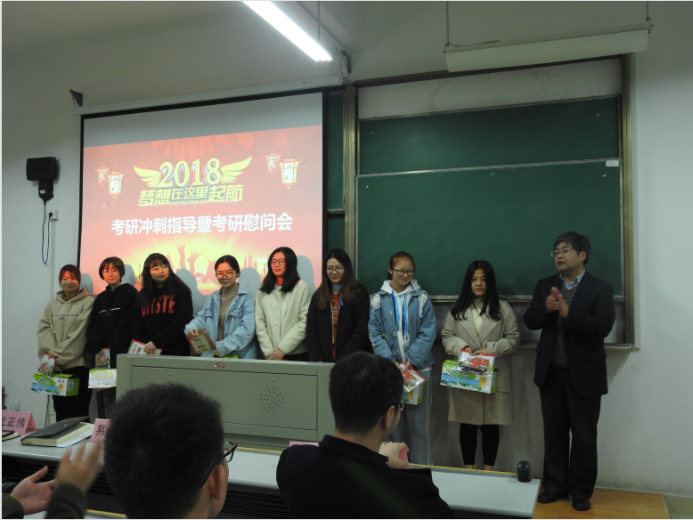 在10号楼402教室召开2019届考研学生冲刺指导会暨考研慰问会。院长易洪雷、副院长李海东、党委副书记黄芳芳、各专业考研指导老师及100余名考研学生参加了此次会议,会议由学工办主任李寒星主持。