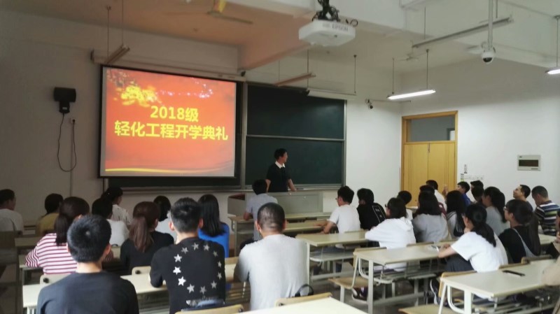 9月17日下午,老虎机 轻化工程系2018级新生开学典礼在梁林校区10号楼406教室举行。系主任及系全体教师出席典礼。