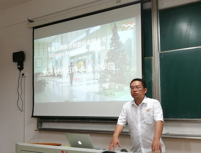 首先,浙江明新旭腾新材料股份有限公司高级人力资源部总经理庄孟冬女士就公司简介、实习岗位设置、实习要求、实习津贴等进行了介绍。其次,人事部经理刘刚先生就招聘流程进行了介绍,实习岗位共计28个(涉及轻化工程、工业设计、环境工程和物流管理等专业)。最后,两位经理先后对学生进行了笔试、面试。
