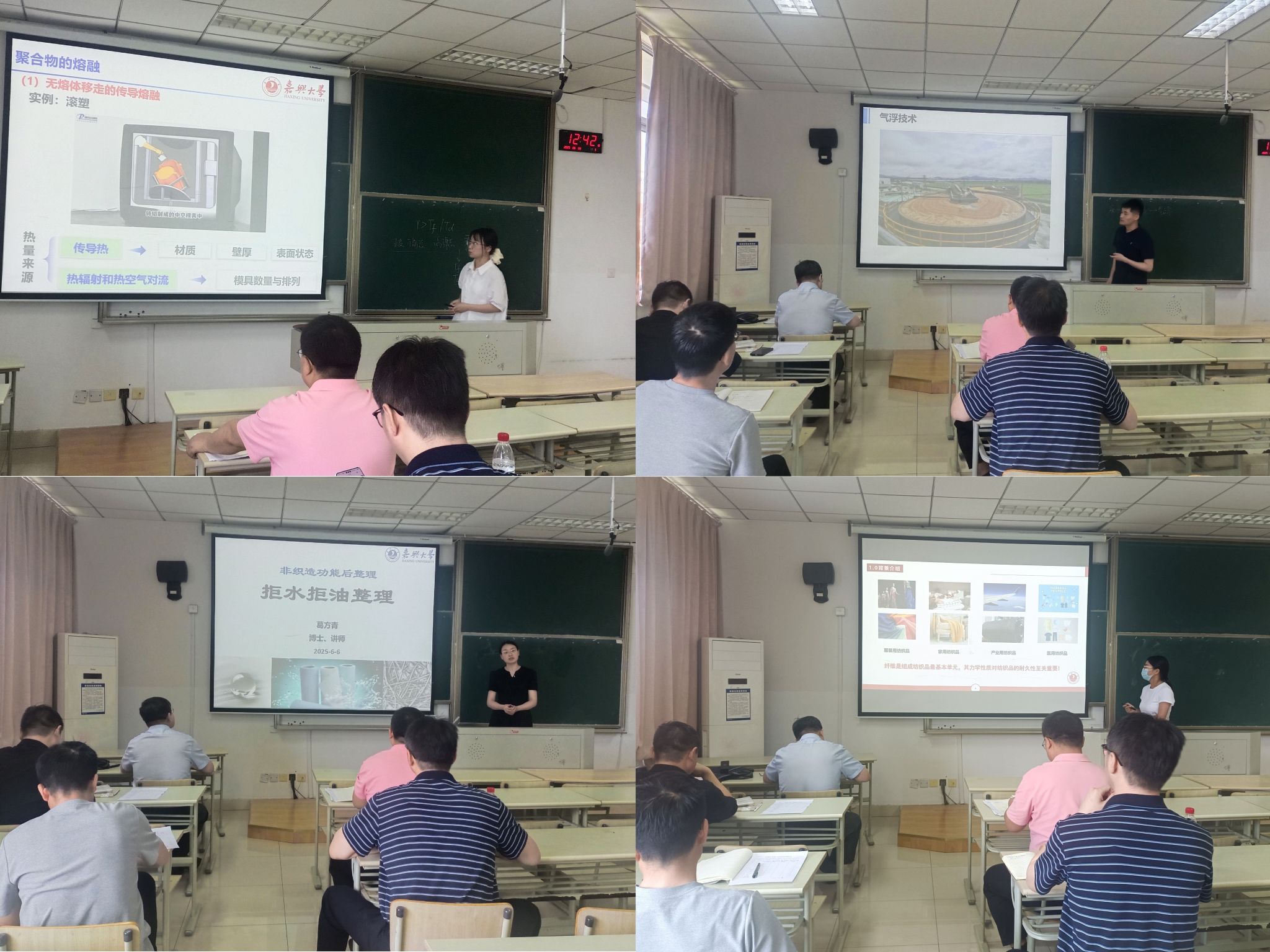 2025年6月6日中午,老虎机 在崇礼楼506教室进行了青年教师助讲培养试讲考核。试讲考核专家小组由老虎机 督导、系部教师代表等五位专家组成。2024年新入职教师葛方青、张天蒙、柯亚楠、易玉丹分别针对《非织造功能后整理——拒水拒油整理》《废水处理技术》《纺织材料学——纤维的拉伸力学性能》《聚合物的熔融》四个课程主题进行了说课和章节试讲。