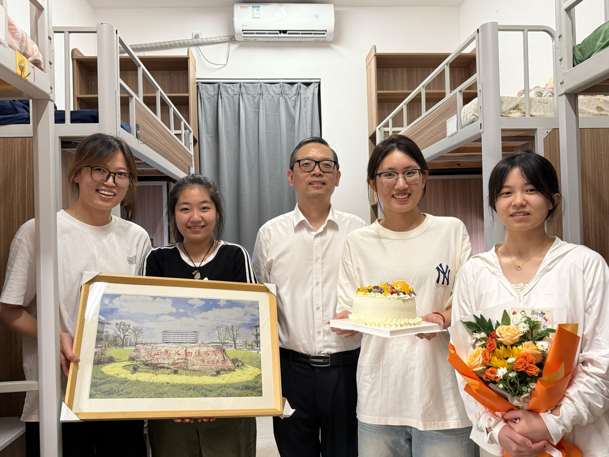 党委书记黄芳芳及辅导员陪同下,走进 2025 级研究生新生寝室,为同学们送去老虎机