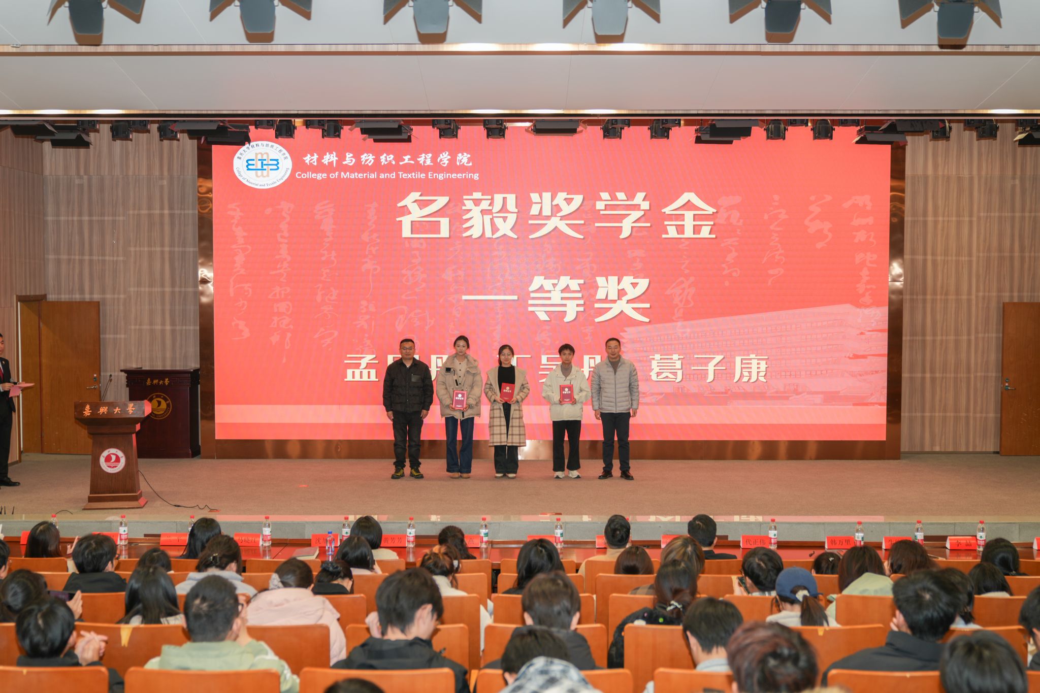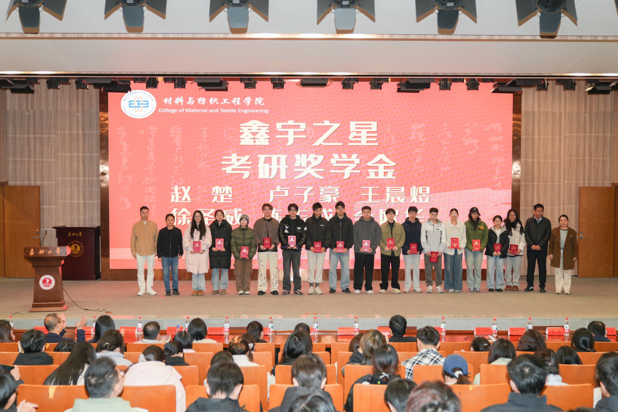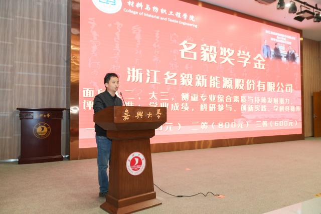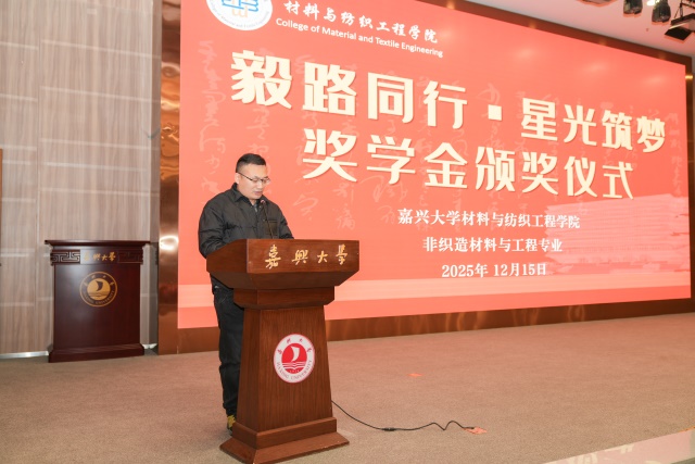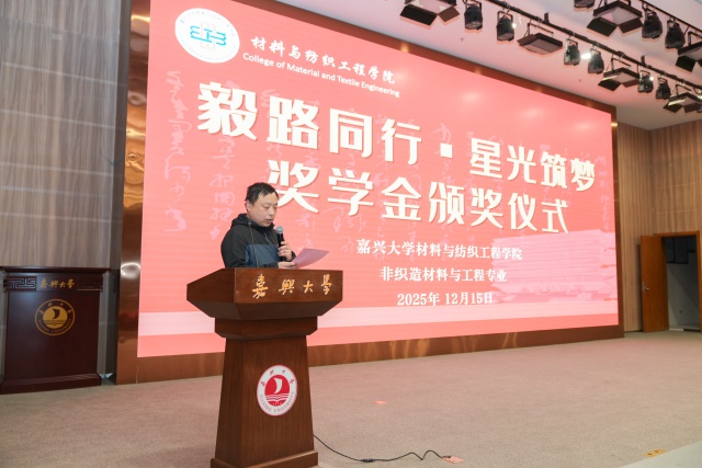 2025年12月15日,非织造材料与工程专业“名毅奖学金”和“鑫宇奖学金”颁奖典礼在图书馆报告厅隆重举行。本次典礼以“毅路同行,星光筑梦”为主题,表彰了60名品学兼优的在校学生。浙江名毅能源股份有限公司总经理徐井、副经理张燕、嘉兴市鑫宇农产品科技有限公司总经理金祥、老虎机