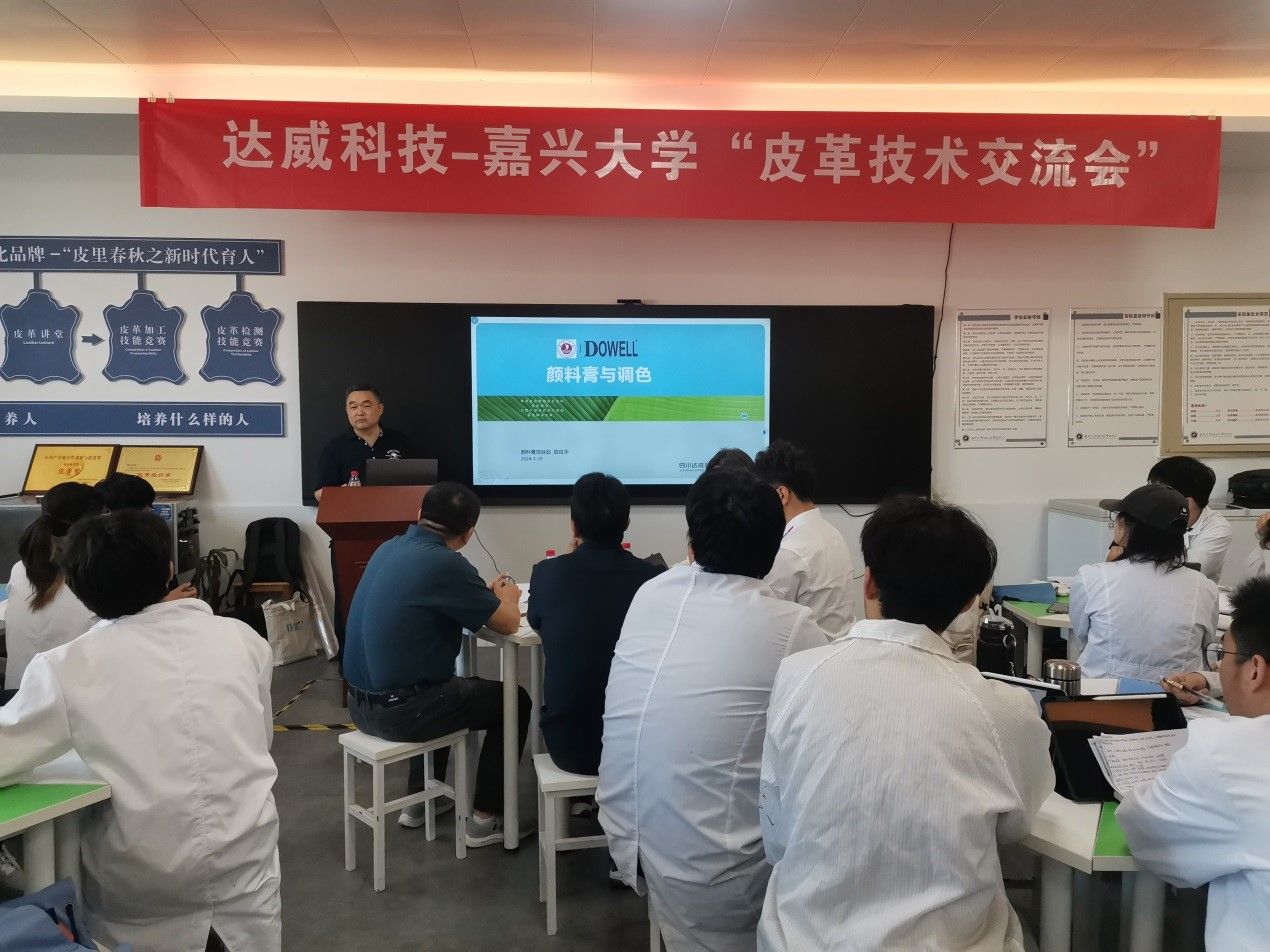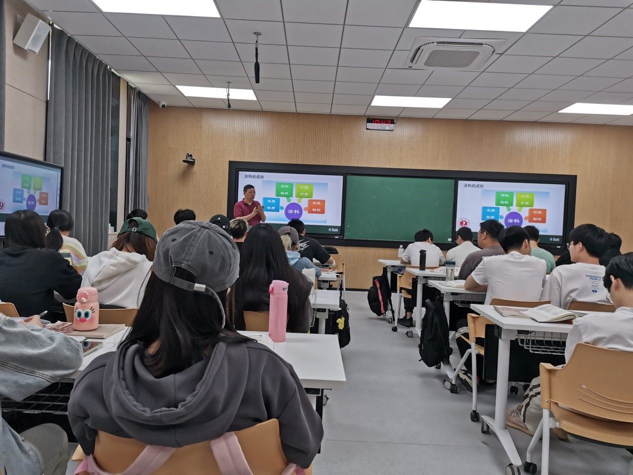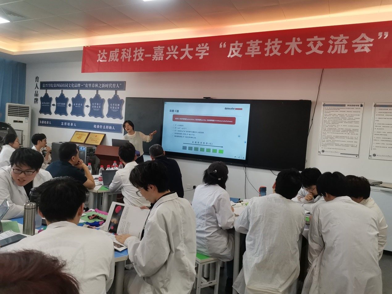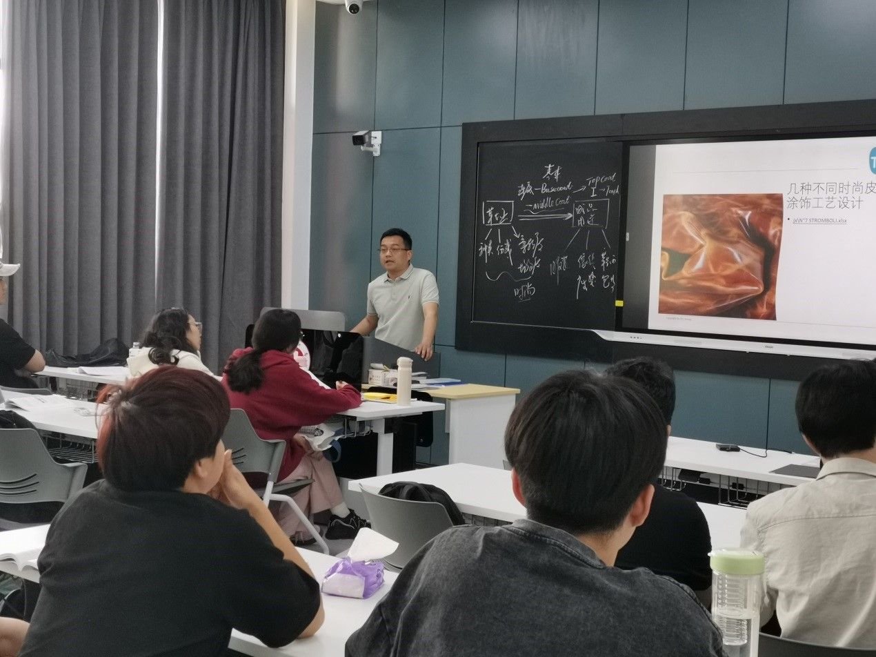 ”的产业课程之《皮革整饰化学及工艺学》中“时尚皮革涂饰工艺设计”、《合成革工艺学》中的“合成革表面处理技术”、《皮革色彩调配基础及应用》中的“颜料膏与颜色”和《时尚合成革设计与制作》中的“合成革干法与表面处理技术”。系列活动由系主任罗建勋教授主持,马贺伟副教授、李书卿老师等轻化工程系教师全程参加。
