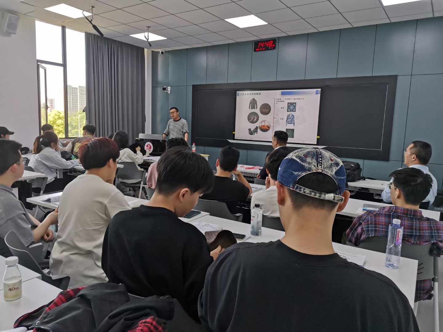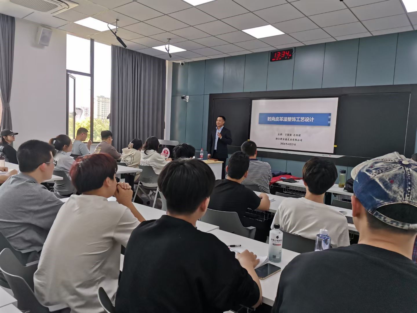 首先,丁国荣总经理和徐志毅总经理就产业课程之《皮革整饰化学及工艺学》的授课内容、讲授方式、重点、难点及达成度情况等进行了研讨。其次,丁国荣总经理以“时尚皮革湿整饰工艺设计”为题给学生们做报告,讲述了近30年来皮革湿整饰工艺的变迁、当前市场流行风格,并就多种流行风格之皮革面料湿整饰工艺设计的关键点进行了讲解。随后,两位总经理参观了轻化工程智慧实验室(产教融合校内基地),了解了老虎机