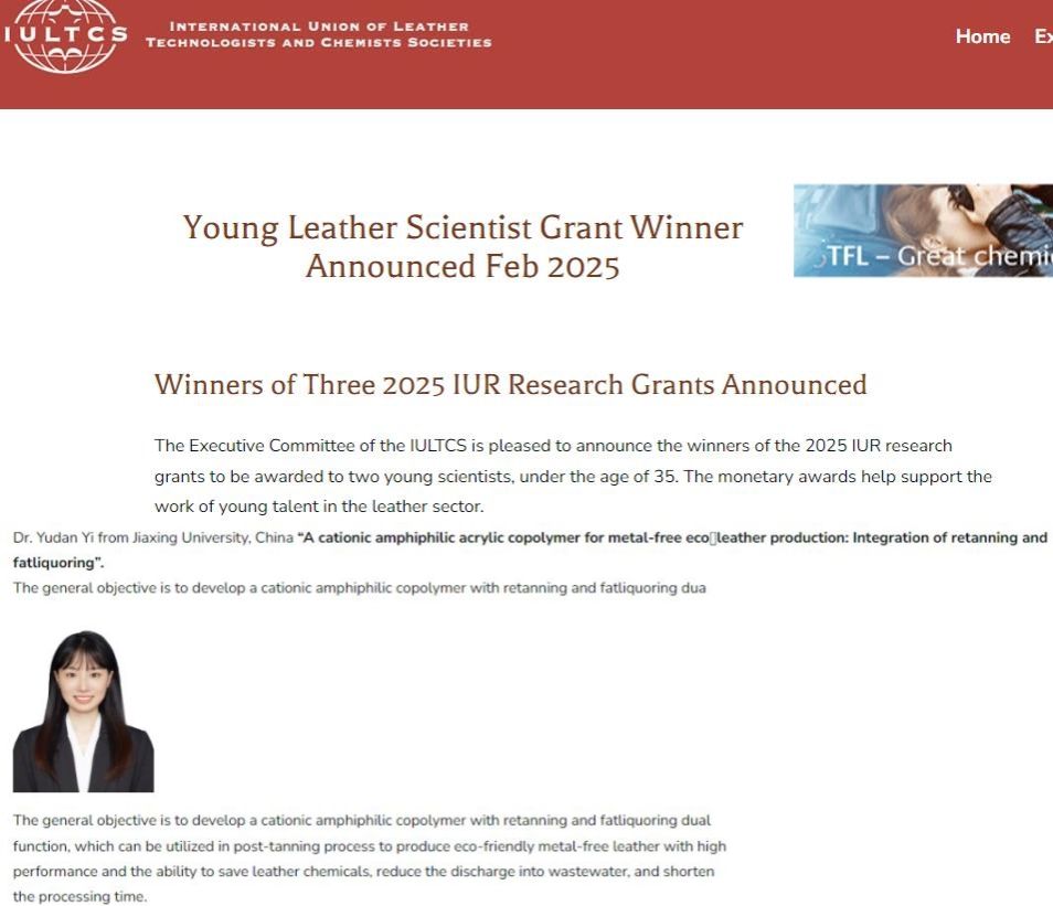 老虎机 轻化工程专业易玉丹博士荣获IULTCS 2025年青年皮革科学家研究资助奖