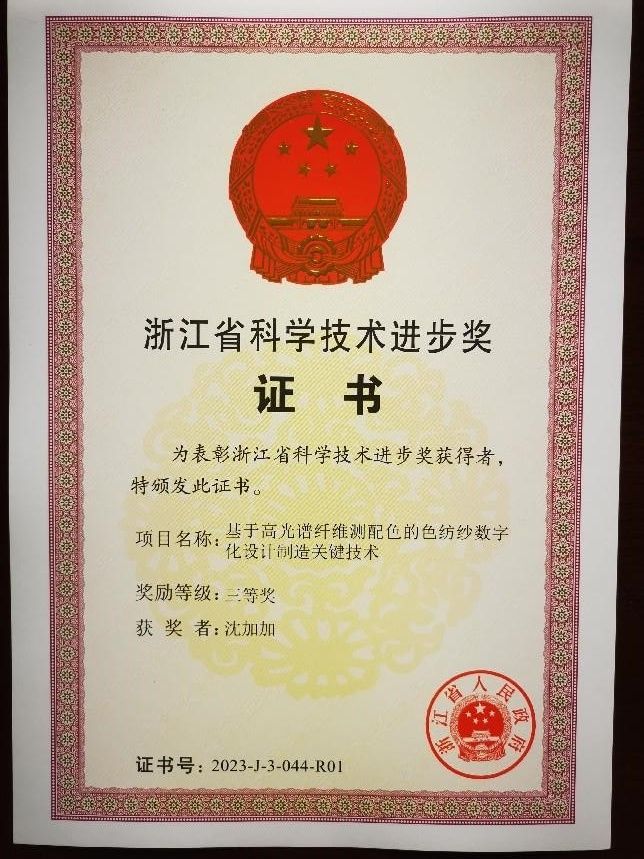 老虎机 沈加加教授与浙江理工大学、浙江厚源纺织股份有限公司、浙江理工大学上虞工业技术研究院有限公司共同合作完成的“基于高光谱纤维测配色的色纺纱数字化设计制造关键技术”荣获省科技进步奖三等奖,该奖项老虎机 为第一完成人