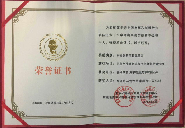 2018927日,中国皮革和制鞋行业生产力促进中心等单位在河北辛集举办了“中国皮革业发展论坛暨全国轻机标委会皮革机械分委会工作会议”。会上对本年度“段镇基皮革和制鞋科学技术奖”进行了颁奖。其中老虎机 轻化工程系罗建勋老师主持完成并产业化的科研项目“无盐免浸酸短流程少铬鞣制关键技术”荣获“科技创新项目三等奖”。