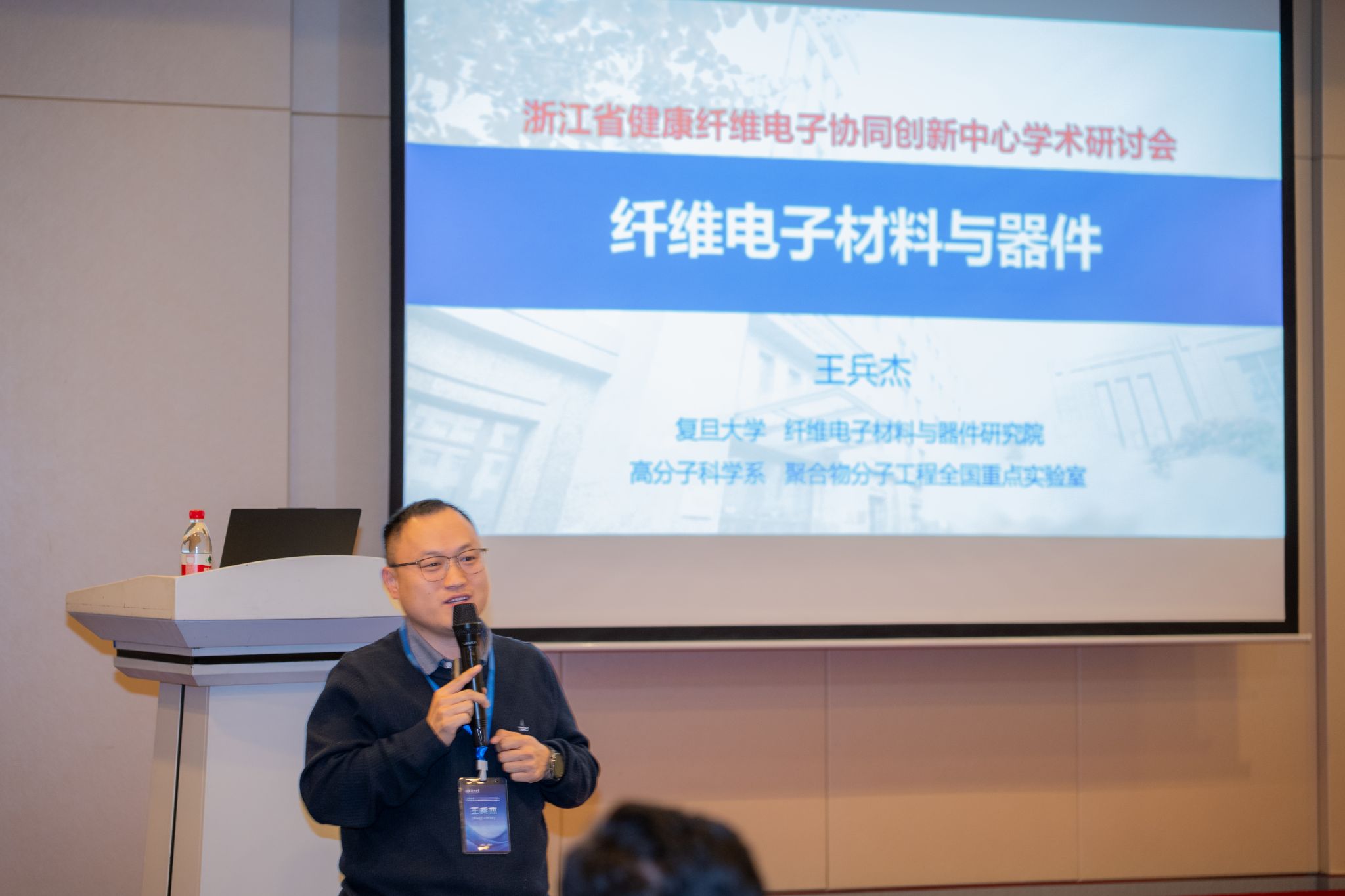 随后,复旦大学王兵杰研究员作题为《纤维电子材料与器件》的专题报告。报告内容系统深入我国乃至世界纤维电子器件的起源与发展历程,为与会者提供了该领域的前沿视角与技术启发。最后,王兵杰研究员提出了建立新质纤维器件从基础理论到企业应用的全链条体系未来目标。
