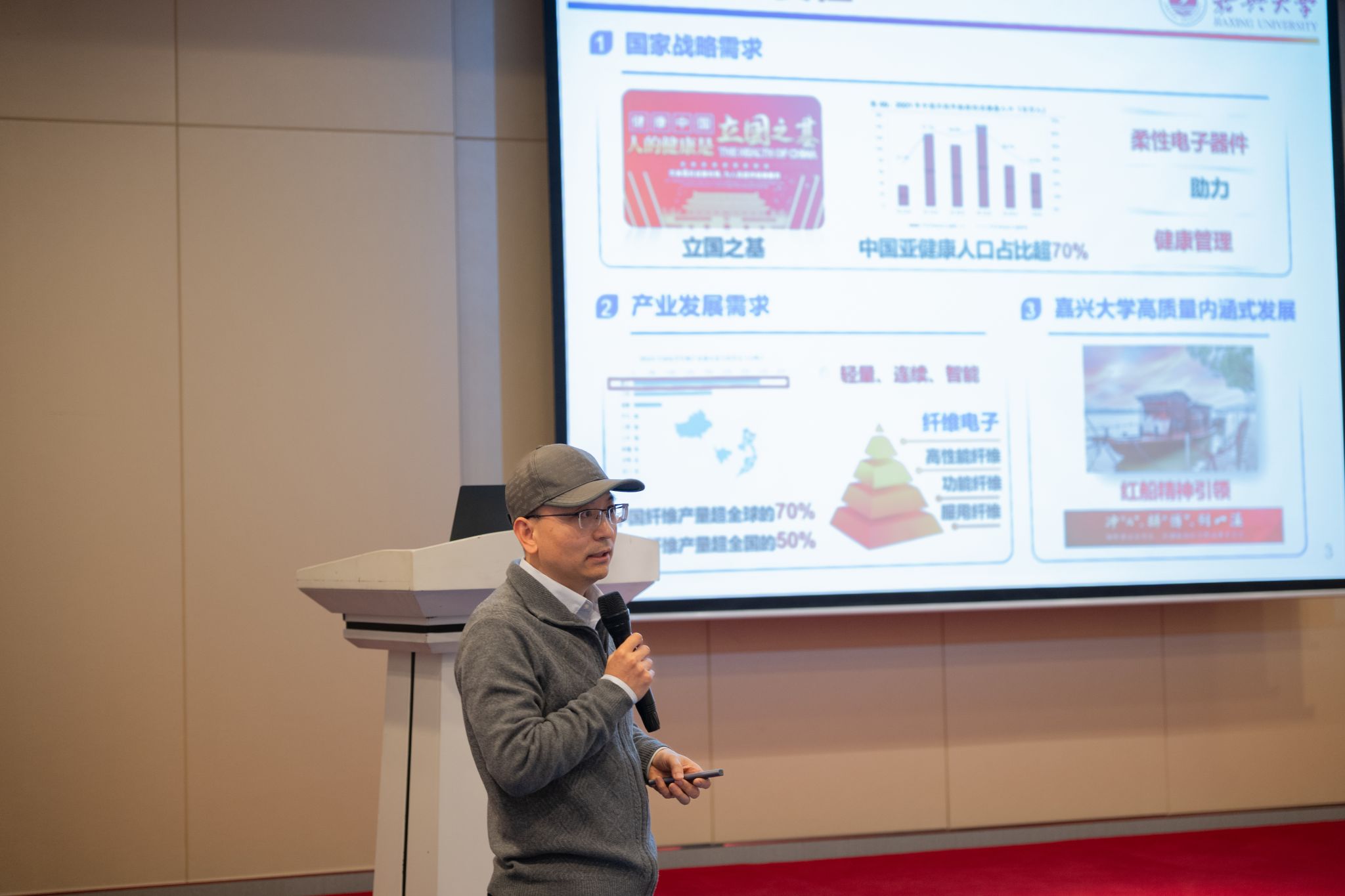 随后,协同创新中心负责人马辉教授介绍了中心建设进展与发展规划,阐述了中心在组织架构、研究方向、平台建设及合作机制方面的布局与成果。马辉教授详细阐述了协同创新中心的成立背景、使命规划与实施路径。他强调,中心旨在整合高校、医院及产业链企业等多方资源,构建覆盖“基础研究—装备工艺—检测评价—规模化加工”的全链条协同创新平台。未来四年,中心计划突破一批关键共性技术,推动一批产业化项目落地,力争实现知识产权与经济效益的同步增长,全力支撑浙江省在健康纤维电子领域抢占产业制高点、培育发展新动能。