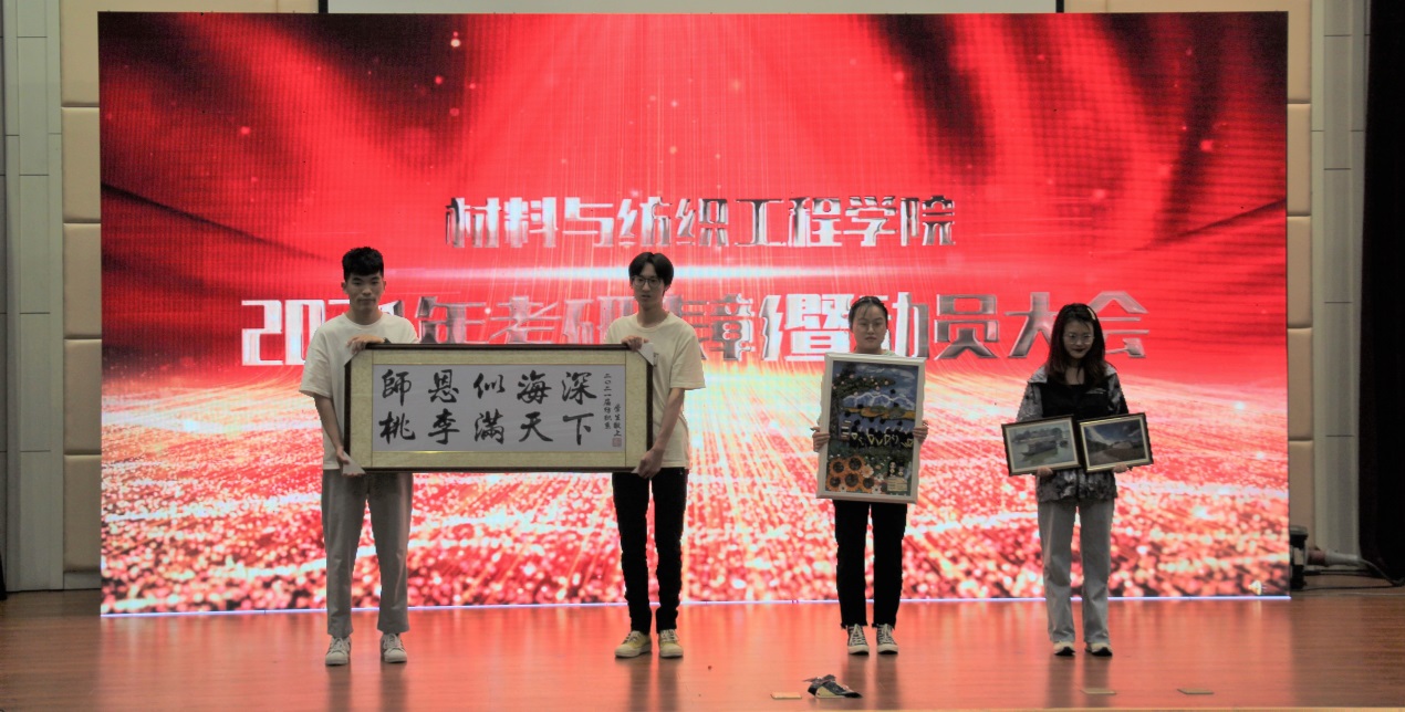 会上首先对考取研究生的优秀学子及涌现出的先进集体进行表彰。随后高材171班胡俊同学从为什么考研、如何考研两方面入手,结合自身实际情况,向大家分享了自己的考研心得及感悟。他认为,考研最重要的是对时间、节奏、心态的把握,要持之以恒、循序渐进。同时,2021届考研学子以短视频形式分享了考研的心路历程,向师弟师妹们传递考研锦囊与祝福。轻化(实验)181班戴诗媛表态发言,她说“风华正茂的我们,要在考研的战场上扬鞭策马,奋勇前进,要以最饱满的热情和斗志,努力拼搏,奋勇向上。”