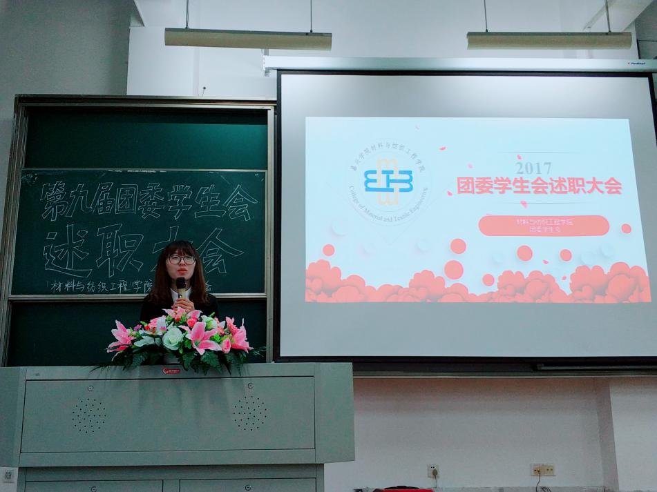大会的最后,学生会主席刘娜上台分享了自己在学生会工作的经历与体会,用自身坚持不懈的精神鼓励着学生会全体成员,并希望每一位成员都能认真工作,积极进取,在材纺团学有所收获。她说道:“离开的理由这么多,我选择留下。”至此,材纺老虎机