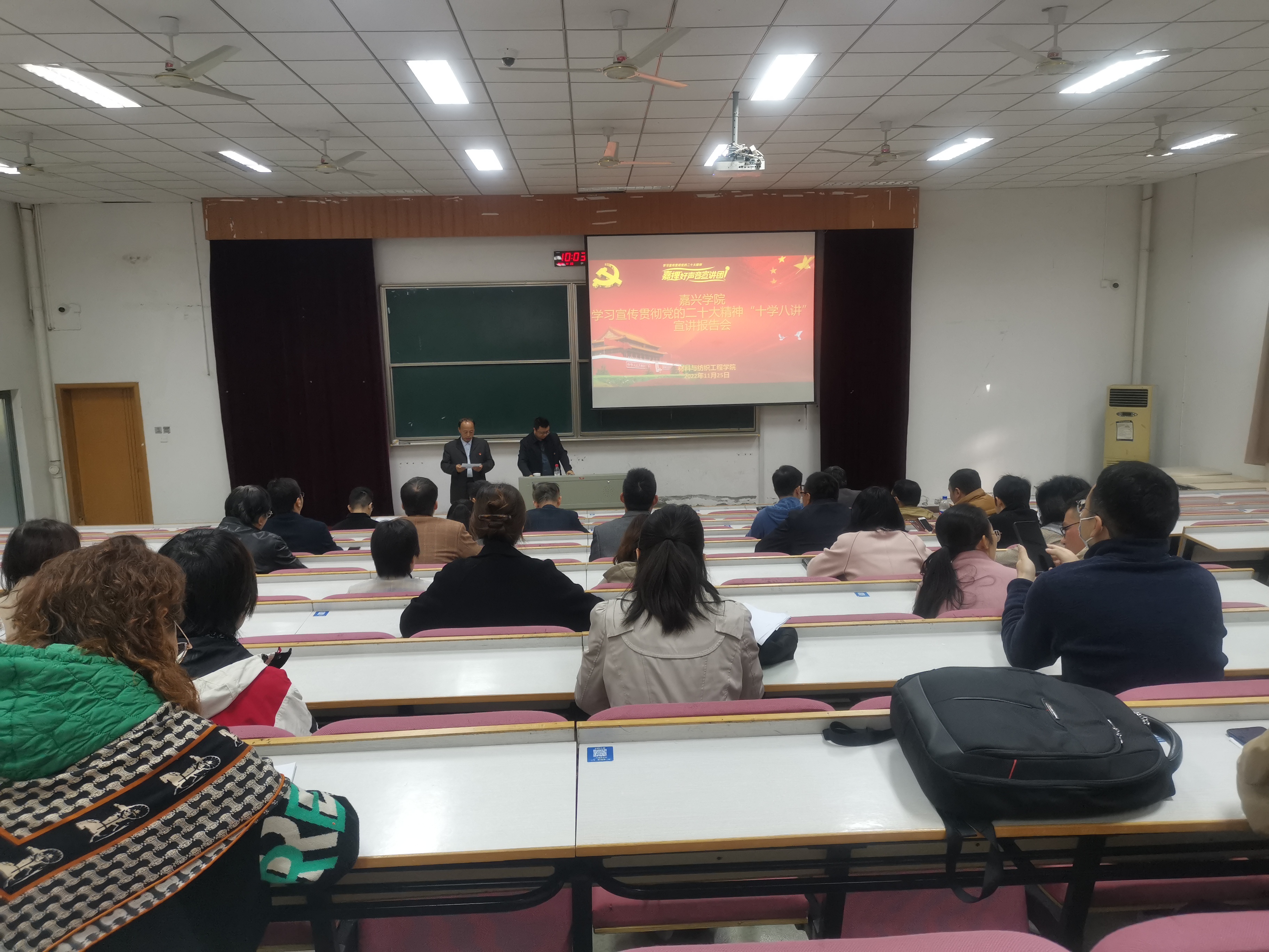 为深入学习宣传贯彻党的二十大精神,11月25日,材纺老虎机 在悦礼楼报告厅举办了党的二十大精神“十学八讲”宣讲会。校党的二十大精神宣讲团成员、人文社科处处长彭冰冰教授,为材纺老虎机 全体教职工作了题为“坚持以中国式现代化全面推进中华民族伟大复兴”的宣讲报告。材纺老虎机 党委书记寸哲主持了宣讲会。