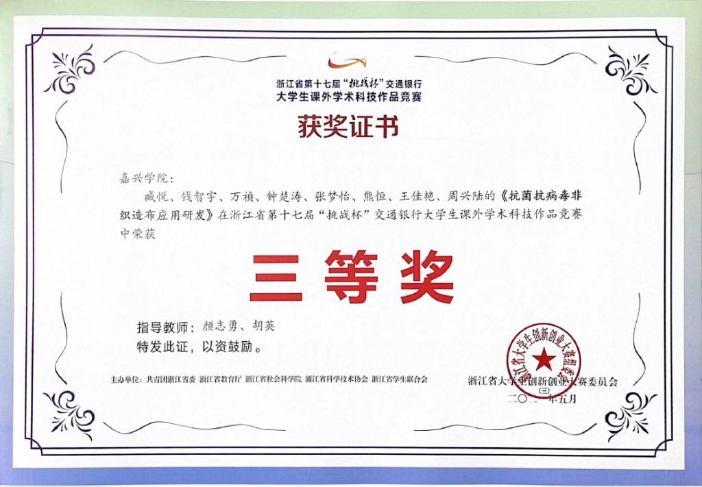 高材教工支部颜志勇教授指导的学生项目获“互联网+”全国大学生创新创业大赛铜奖1项,指导的项目:“益志新材料—抗病毒冷链包装材料领航者”获“建行杯”浙江省国际“互联网+”大学生创新创业大赛暨第七届中国“互联网+”大学生创新创业大赛选拔赛中获省级金奖1项。项目“抗菌抗病毒非织造布应用研发”获挑战杯省级三等奖1项。