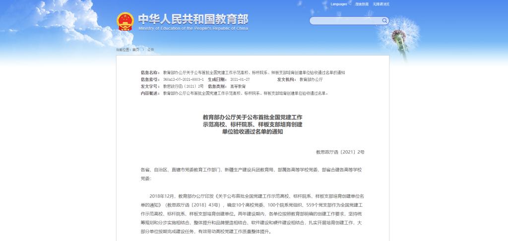 1月26日,教育部办公厅发布了关于公布首批全国党建工作示范高校、标杆院系、样板支部培育创建单位验收通过名单的通知(教思政厅函〔2021〕2号),其中,老虎机