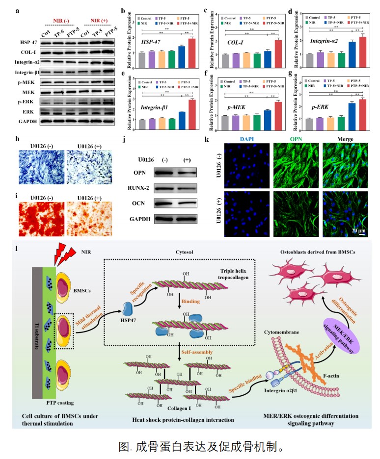 骨组织创伤严重影响患者的行动能力。临床上,可通过植入生物材料实现损伤骨组织的修复与再生。钛合金是一种常用的骨科植入材料,但其表面的惰性不支持新骨形成,易导致植入手术失败。此外,材料植入后引发的免疫排斥反应及细菌感染也会抑制新骨的形成,降低植入手术成功率。通过在植入体表面设计生物活性涂层可有效促进新骨的再生。针对以上问题,本工作通过溶液浇筑联合原位聚合,在钛植入体表面制备了一种多功能PDA/Ti3C2/P(VDF-TrFE)生物活性纳米复合涂层。该涂层具有优异的近红外(NIR)光热效应。研究表明,在NIR激发下,该涂层显著促进了细胞的成骨分化与新骨形成,这主要得益于温和的光热刺激活了整合素介导的MEK/ERK成骨信号通路。免疫调节实验结果显示,涂层表面温和热刺激促进了巨噬细胞向抗炎的M2分型极化,这可以减轻炎症反应并促进新骨生成。此外,该涂层还显示出优异的光热抗菌性能,对大肠杆菌与金黄色葡萄球菌的抗菌率均超过了99%。这些研究表明,该涂层是一种具有潜在临床应用价值的生物活性涂层,可为骨科医疗器械的表面功能化提供借鉴。该工作得到了国家自然科学基金(32271373、51902135)和浙江省自然科学基金(LY22E020013)等项目的资助。