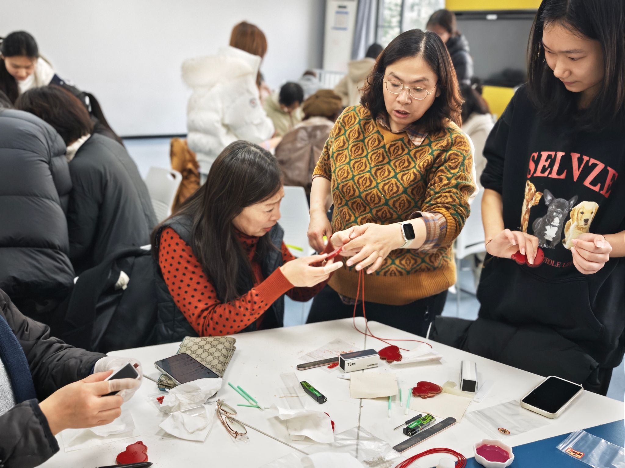 标识的辅助图像,同时“平安、喜乐”也代表了对老师的深深祝福。初次接触皮革工艺的老师们在志愿者的悉心协助下逐步进行贴合、打磨、抛光、穿线、编线等步骤。现场气氛既安静专注,又不时爆发出阵阵欢声笑语。当有老师出现小错误,或惊喜地发现自己的作品逐渐成型时,彼此间的交流与鼓励让活动充满了温暖融洽的氛围。